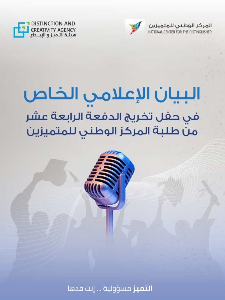 يسر إدارة المركز الوطني للمتميزين في هيئة التميز والإبداع ان تضع بين أيديكم كافة التفاصيل الخاصة بحفل تخريج دفعة جديدة من طلاب المركز الوطني للمتميزين من خلال البيان الاعلامي.