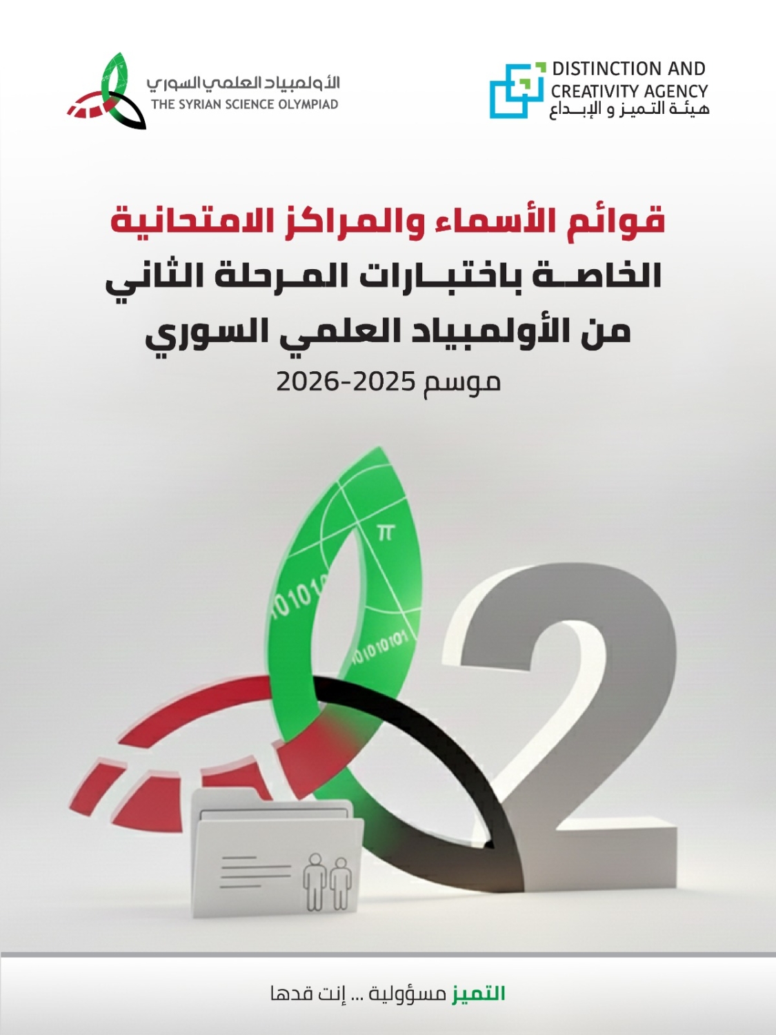 تعلن إدارة الأولمبياد العلمي السوري في هيئة التميّز والإبداع عن قوائم أسماء الطلاب والمراكز الامتحانية الخاصة في اختبارات المرحلة الثانية من الأولمبياد العلمي السوري لموسم ٢٠٢٦ للطلاب المتأهلين من المرحلة الأولى، والمقرّر إجراؤها يوم السبت ١٣ كانون الأول عند الساعة العاشرة صباحاً، في مراكز المحافظات.