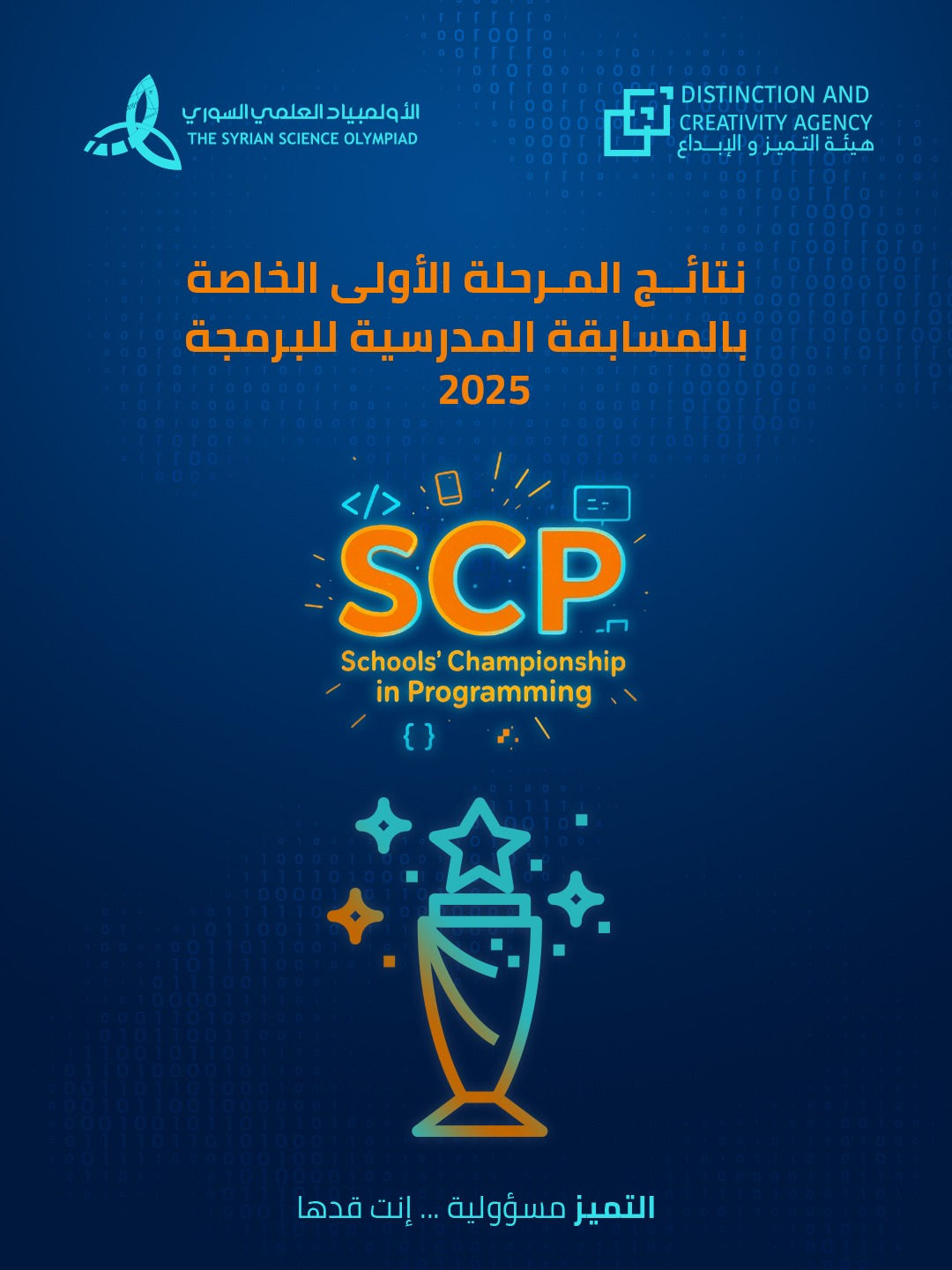 تعلن إدارة الأولمبياد العلمي السوري في هيئة التميز والإبداع عن أسماء الفرق المتأهلة إلى المرحلة الثانية من منافسات البطولة المدرسية للبرمجة SCP 2025، وذلك بهدف انتقاء الفريق الممثّل لسورية في أولمبياد المعلوماتية الدولي للفرق المدرسية IIOT – International Informatics Olympiad In Teams 2026.